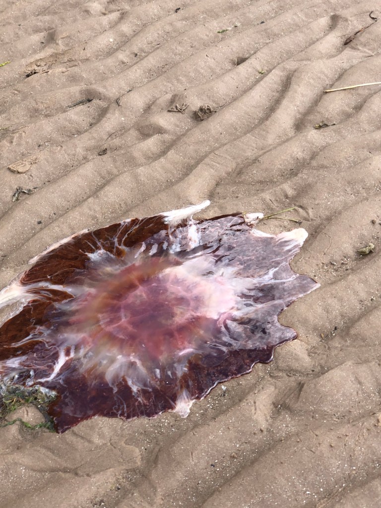 An absolutely massive jellyfish at low tide.