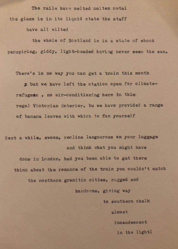 A little foreshadowing … we were still thinking about our cancelled sleeper train several days later (Day 18) when we were in London, walking along the Southbank and we came upon a couple of poets offering “Pay What You Like Poetry” on any topic that we wanted. Obviously, we chose our recent experience on the sleeper train and we received these excellent poems that beautifully sum-up our experience.