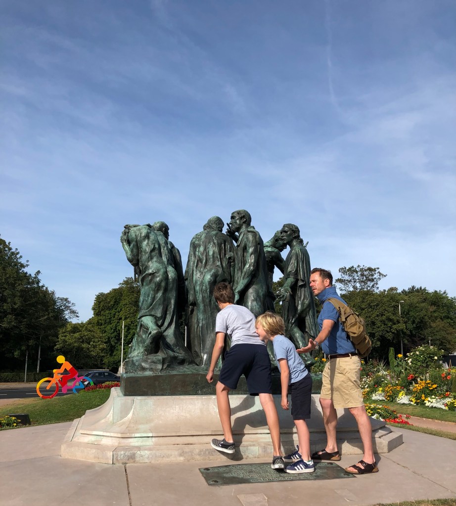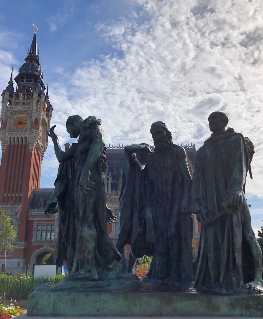 Calais was prettier than expected. The Tour de France had just come through town so there was lots of fresh paint and newly planted flowers. We visited the famous sculpture by Rodin, Monument aux Bourgeois de Calais, commissioned by Calais in 1884. It depicts the unlucky souls chosen to hand over the keys to the city to the King of England at the end of a particular siege during the Hundred Years’ War. According to the Rodin Museum, “The six characters are individualized … but independent. Alone facing their destiny and death, they do not look at each other, do not touch … the condemned men begin their slow funeral march. Rodin gives each figure … a particular gesture and movement – from despair to abandonment, from confidence to resignation.”
