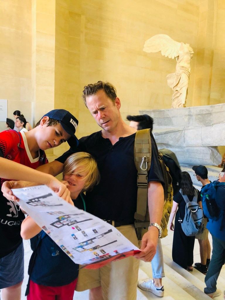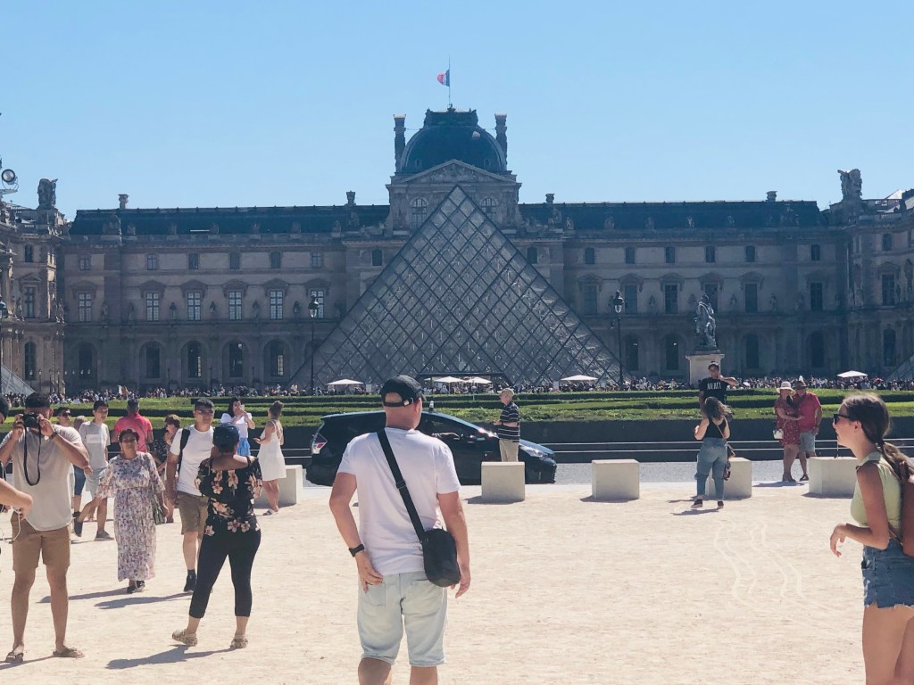 We took the metro to the Tuileries stop and walked through the Gardens to the Louvre Pyramid. There were many vendors alongside the lead-up to the pyramid and Alexander kept asking to get a mini light up Eiffel Tower (he didn’t!). Once we got there, there were SO many people waiting in line. It looked like a packed concert venue. Even though we had timed tickets, we talked about LEAVING. But after a bit of debating, we decided we would stay, as we were told the line should only take 20 minutes (but 20 minutes standing in 94 degrees is still pretty awful), but we didn’t think we would see the Mona Lisa because of all the people (foreshadowing…)