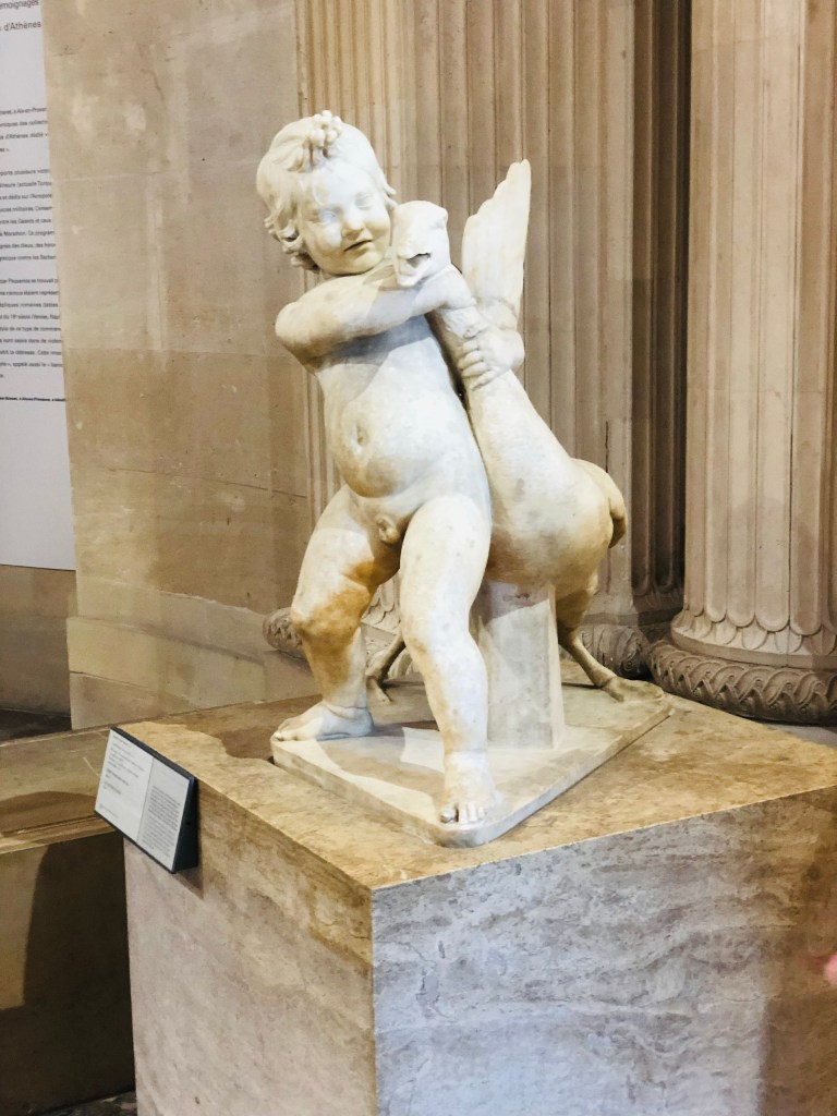 Alexander and I really wanted audio guides, because they were Nintendo 3DS XL’s, but we couldn’t, sadly (because my parents are mean). First, we were going to see Winged Victory, the headless statue of victory, or the statue of Nike. On the way, we passed by some really funny statues, like the saytr, and the boy strangling a goose, or a duck, or something.