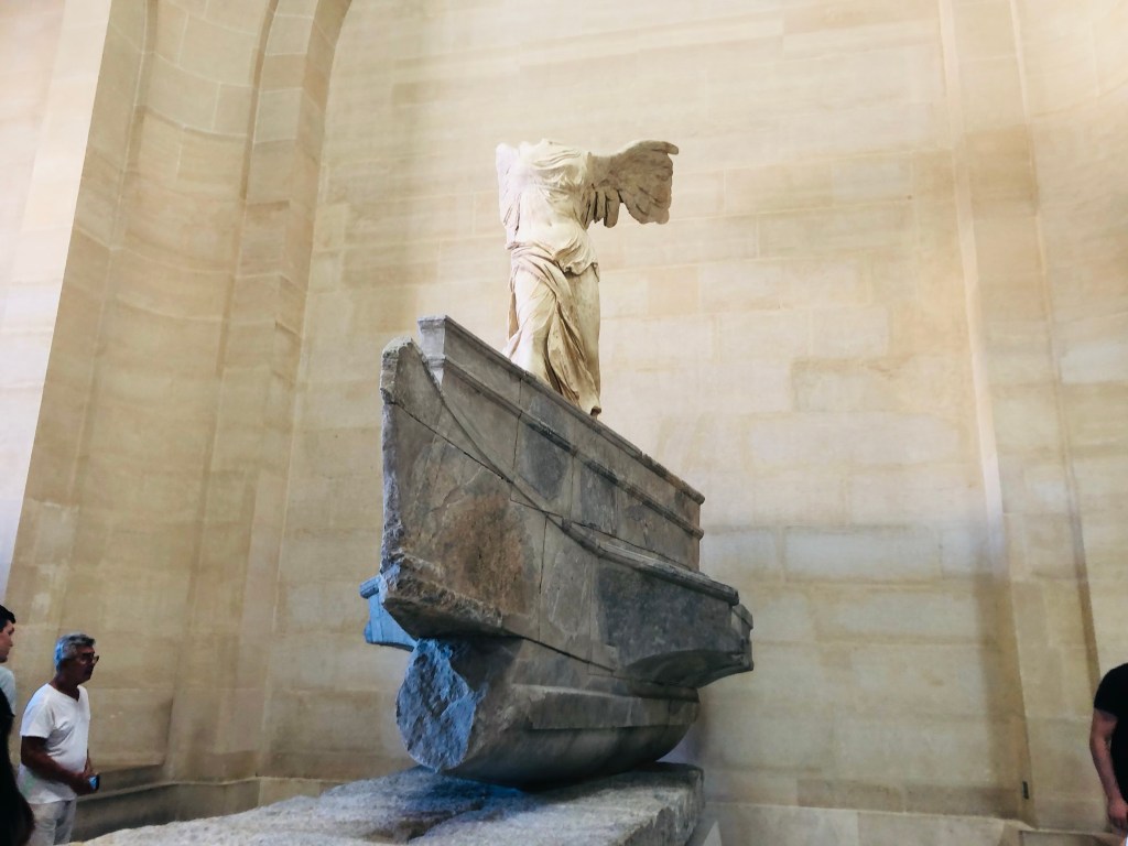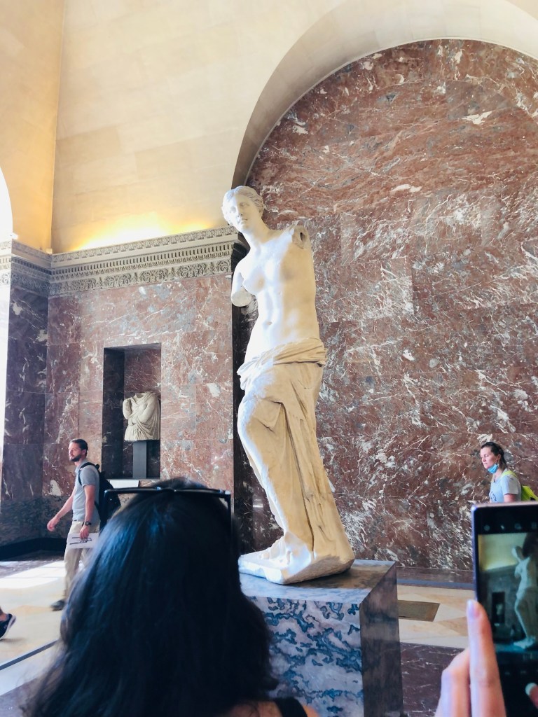 After that, we passed by the statue of Nike on the way back and just admired it from afar. Then we quickly headed down to The Venus de Milo, even though we had seen it briefly without realizing that it was the Venus de Milo. I was the only one that took pictures and got up there while the rest of them stayed back and admired it in all its glory from in front of a column.
