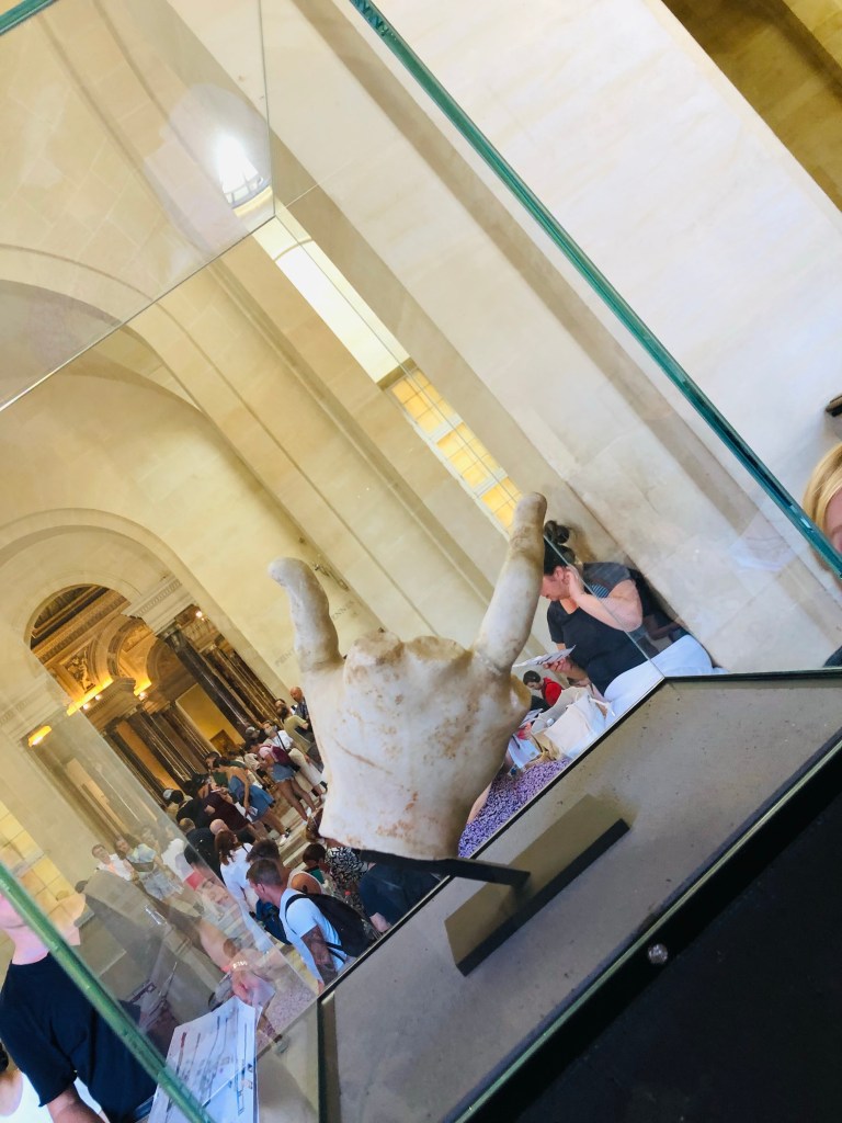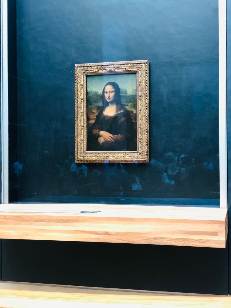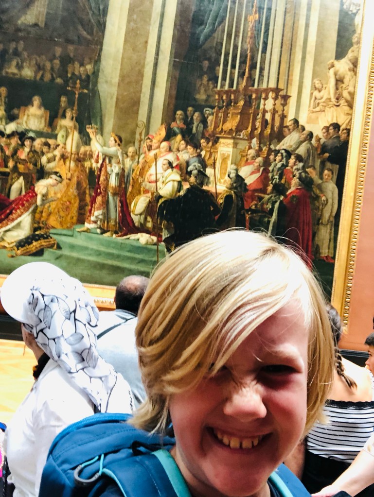 After Nike, we decided we would go to the Mona Lisa, even if it was very crowded. As we headed there we said we wanted to see the painting of Napoleon’s Coronation after the painting of the French Revolution and the Mona Lisa. Once we arrived, we saw that there was a line! We were so glad about this because that would mean we might be able to get to the front! We took pictures as we gradually made our way there, and we talked about the Mona Lisa’s smile, and how her eyes seem to follow you. Once we got to the front, yes, GOT TO THE FRONT, we had a bunch of clear shots of it. It was very cool.