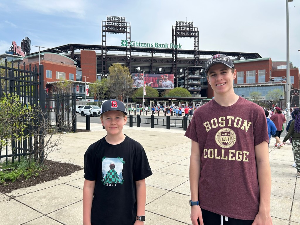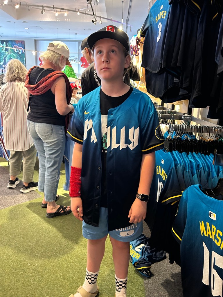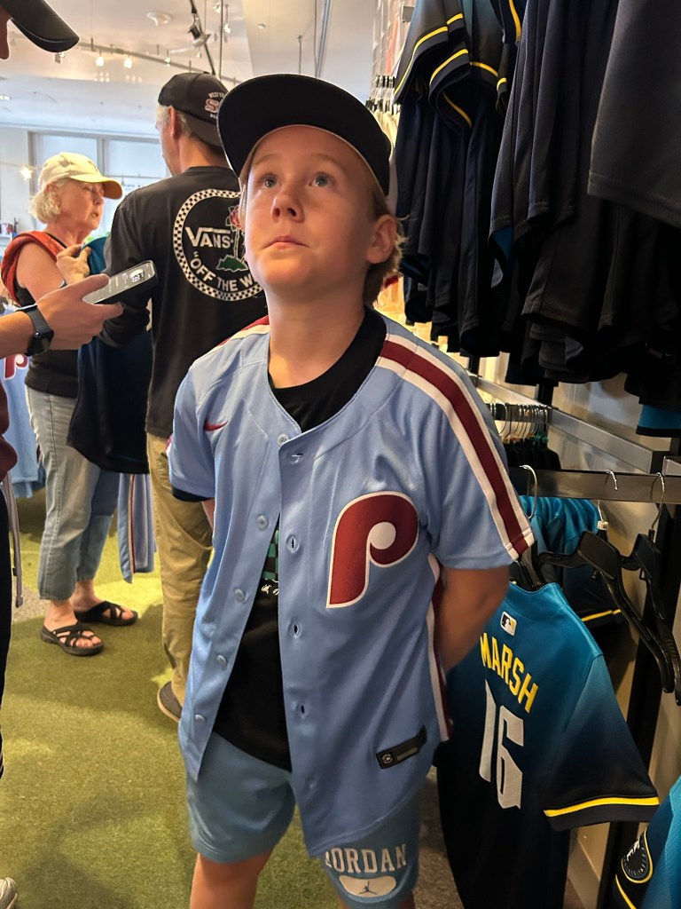 We arrived in Philly around 11 and got to our hotel in Center City. We walked to City Hall, past the Liberty Bell, to catch the Sports Express SEPTA train to Citizens Bank Park. Kids under 11 are free on the train and it only cost $1 for Xavier and me (just like the bet that Randolph and Mortimer made in Trading Places!)